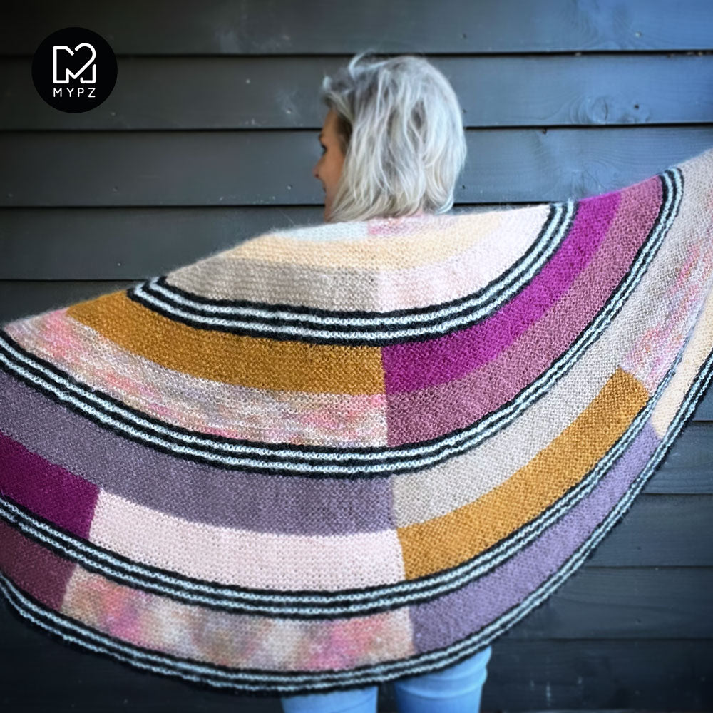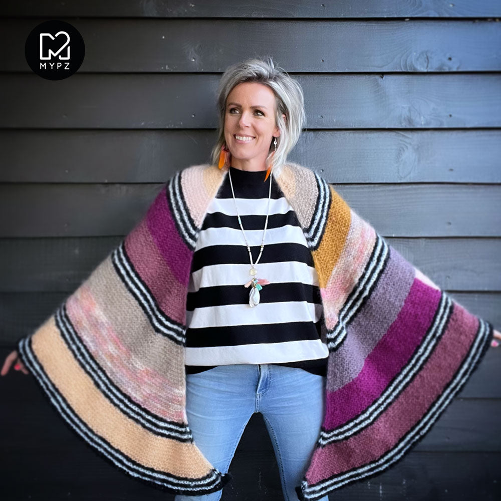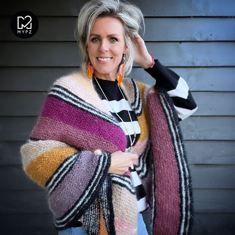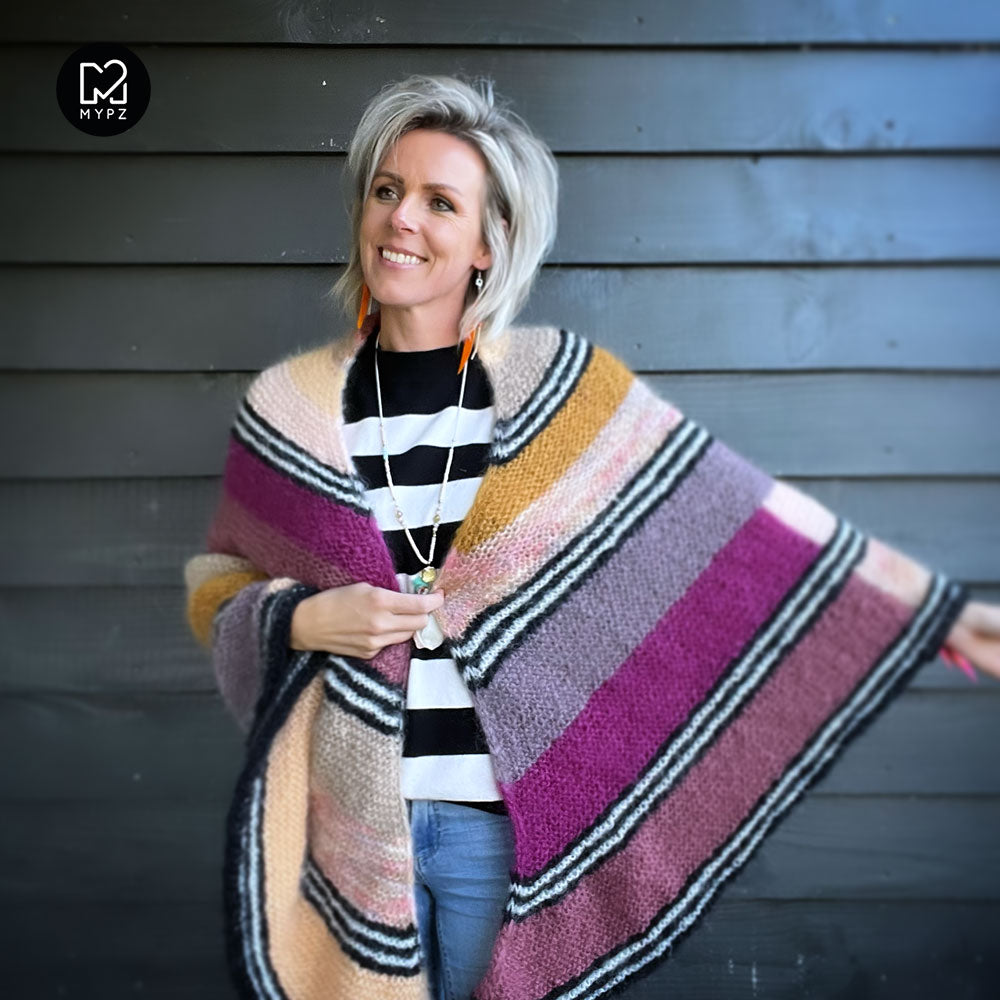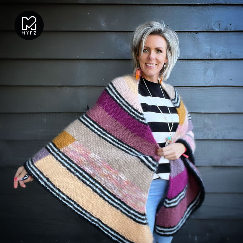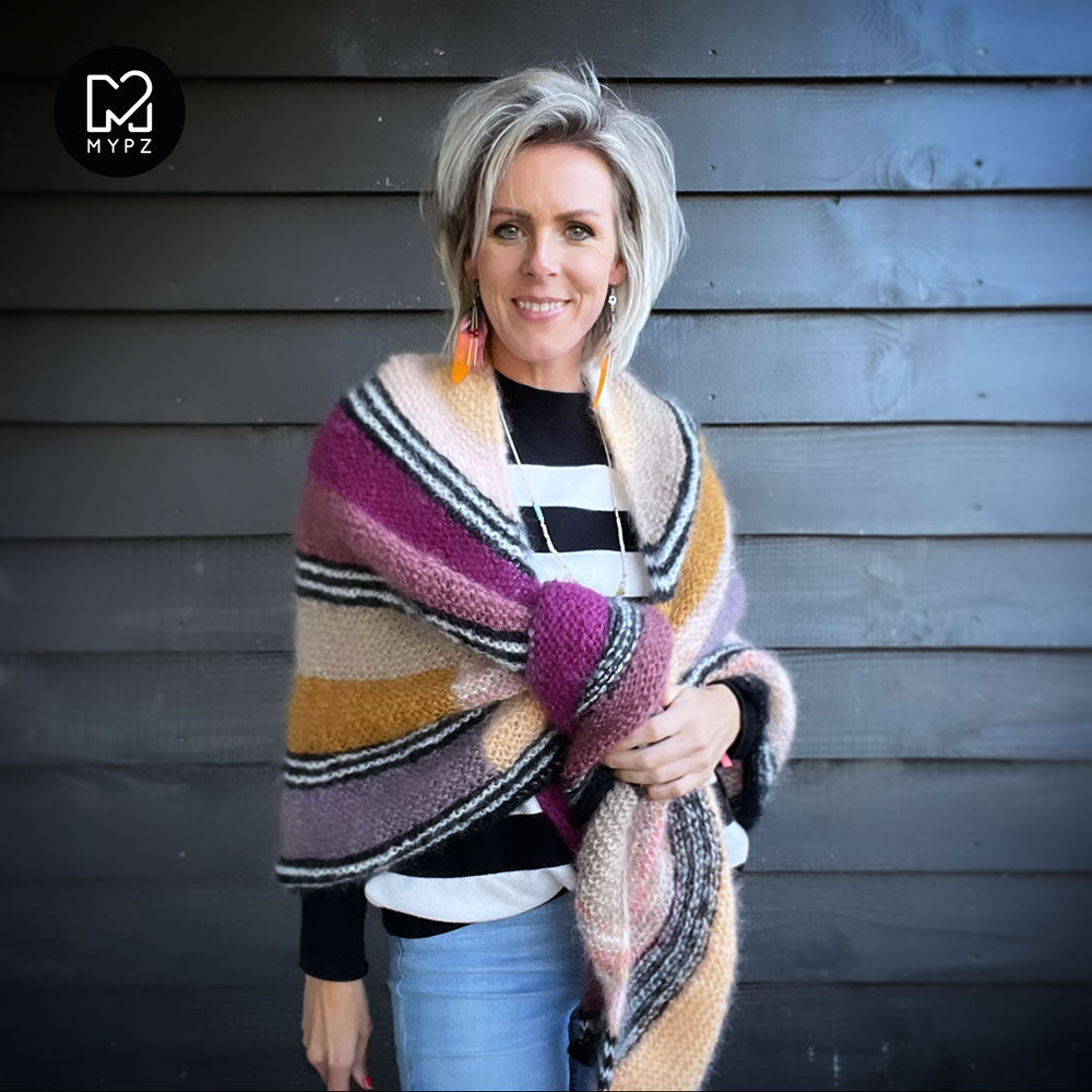 This soft warm shawl is a pleasure to wear and lightweight. This kit contains MYPZ Chunky Kidmohair DK, a high quality fine brushed mohair that does not pill.