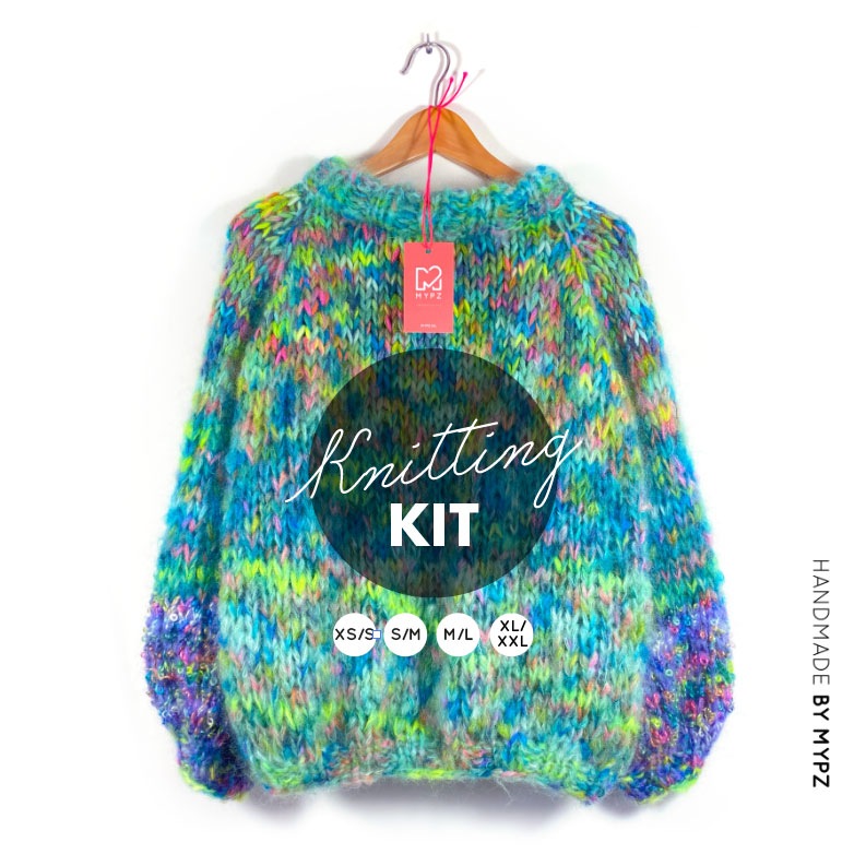– 1x MYPZ chunky kidmohair hand-dyed Mohair Loops Happy Forest (part on the sleeves) (you can leave this out and replace it for bright purple or turquoise)