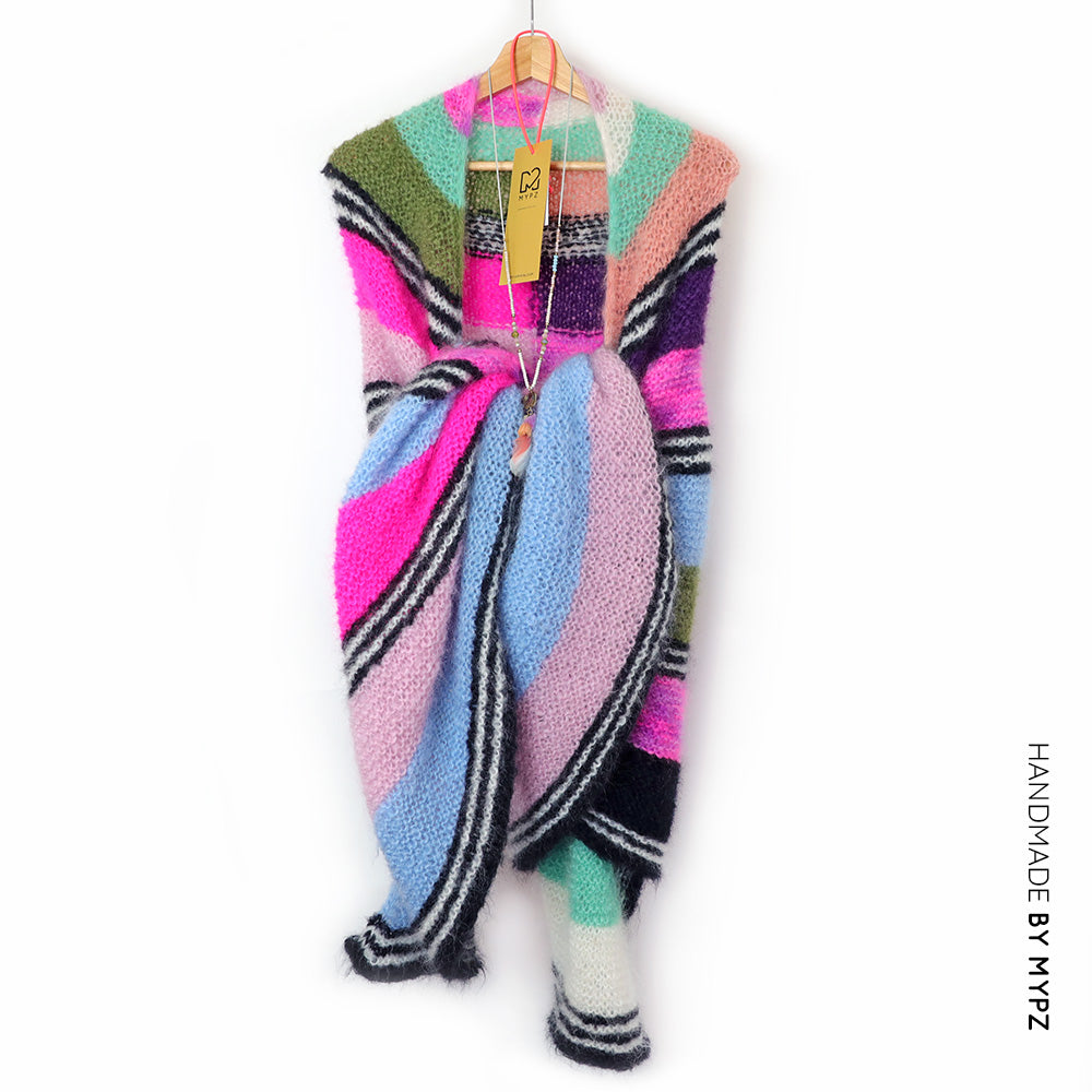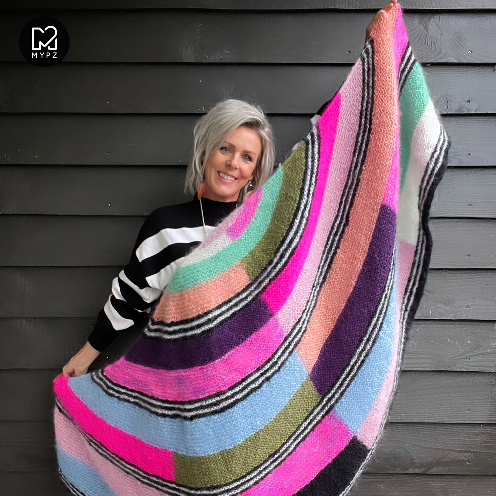 This soft warm shawl is a pleasure to wear and lightweight. This shawl is made with MYPZ Chunky Kidmohair DK, a high quality fine brushed mohair that does not pill.