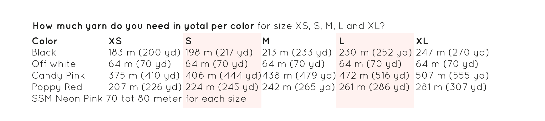Wie viel Garn benötigen Sie insgesamt pro Farbe für die Größen XS, S, M, L und XL?