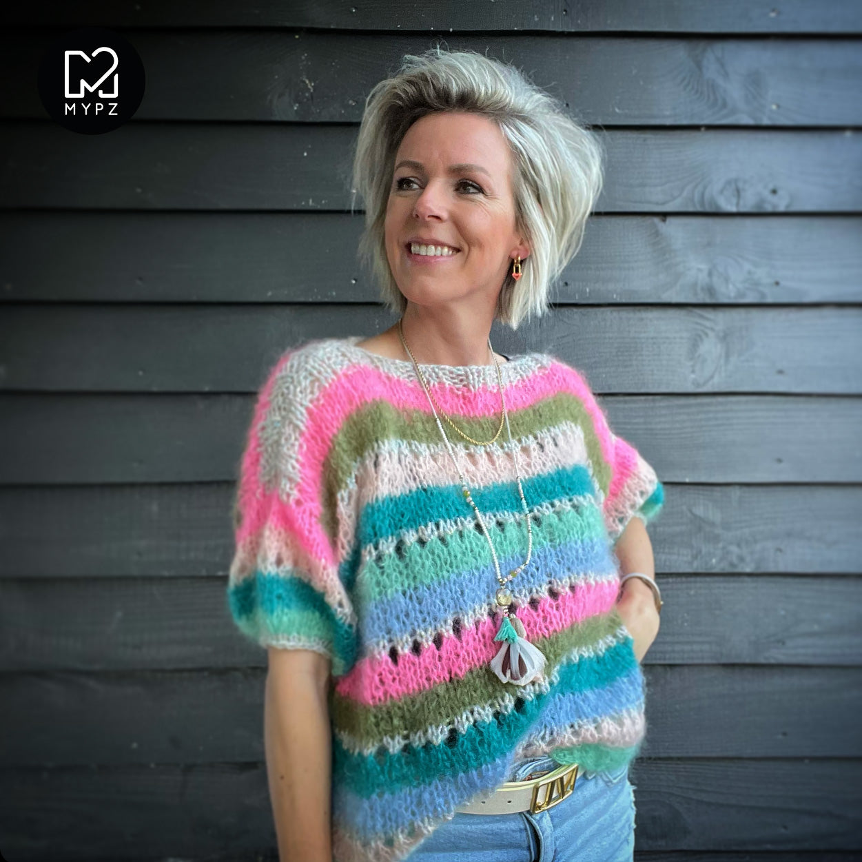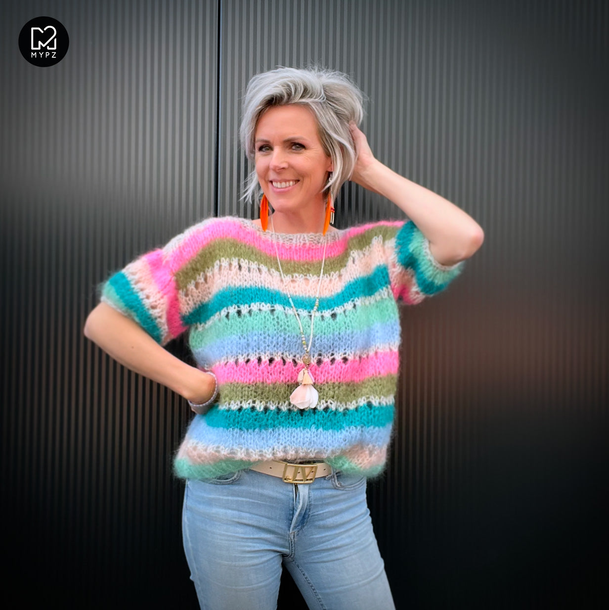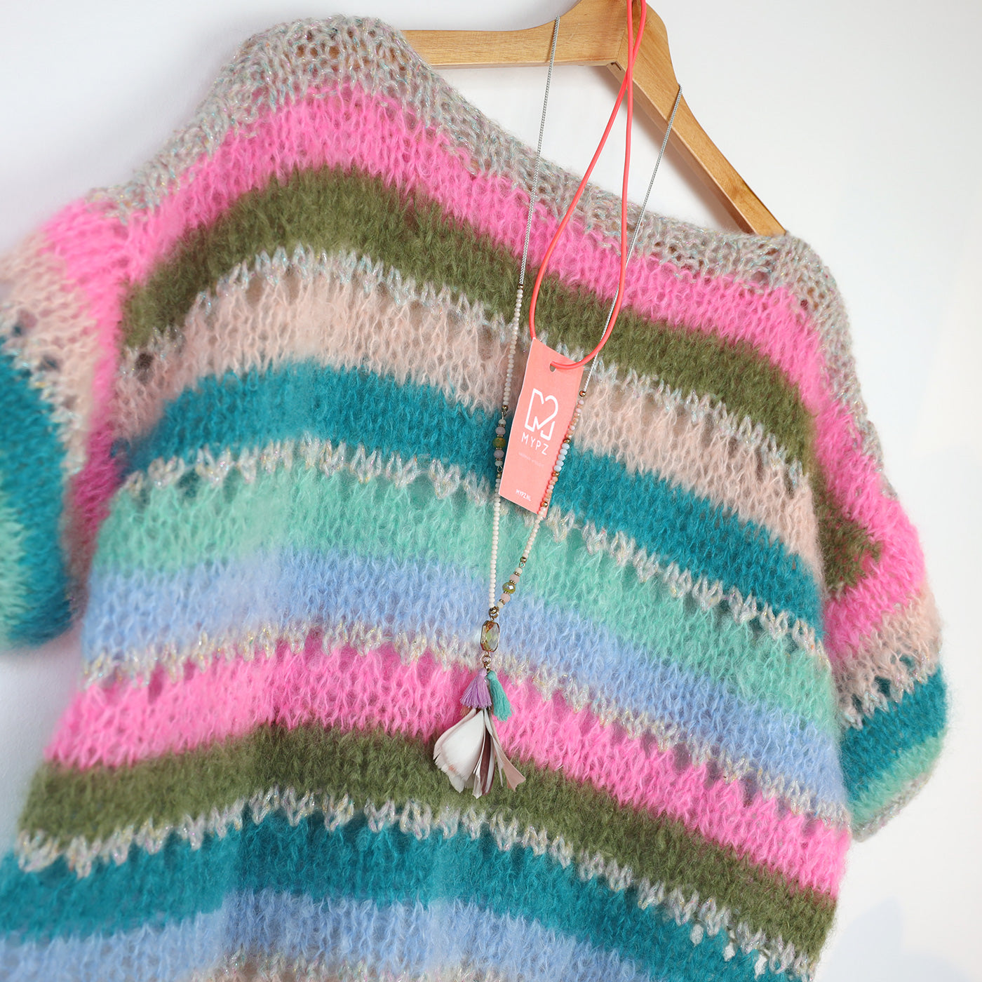 This is a handmade knit made by MYPZ in The Netherlands. Each cardigan or sweater is a unique piece and we take a lot of time and care to create these beautiful products. This beautiful sweater is made of a high quality mohair and does not pill. It is very light, warm and comfortable. These brushed yarns may shed a little but after a while, this will subside.